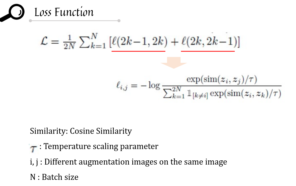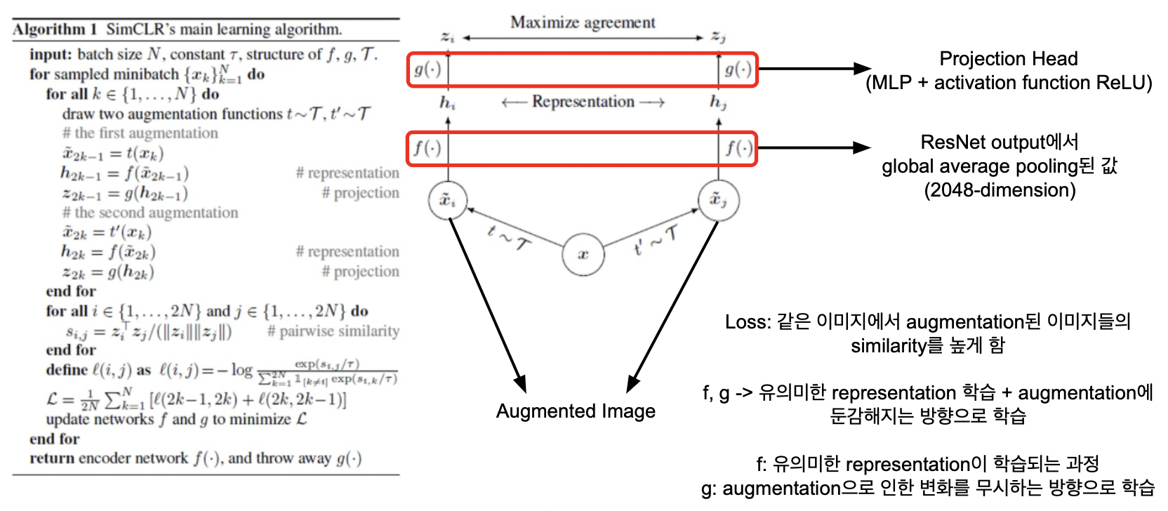 : 입력 받은 이미지들의 비슷함 정도 (Similarity)를 비교하는 과정을 거침. 비슷한 이미지끼리는 positive pair로 분류하고 다른 이미지끼리는 negative pair로 분류하여 대조하는 과정을 통해서 representation을 학습하게 됨.